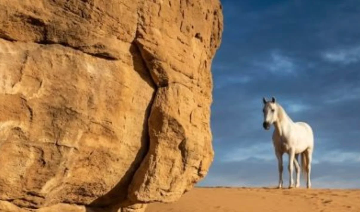 Το τρίχωμά του έλαμπε μέσα στο απέραντο γαλάζιο, άθικτο από τη σκόνη. Η χαίτη του κινούνταν απαλά στον καυτό άνεμο. Μα ήταν τα μάτια που πάγωναν τον χρόνο — σκοτεινά, έξυπνα, ακλόνητα.