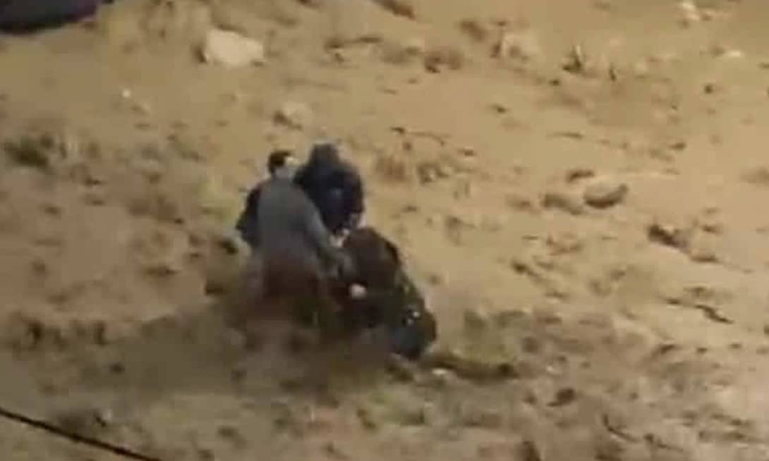 Ένα ζευγάρι προσπαθεί να περάσει τον δρόμο που έχει μετατραπεί σε χείμαρο απο τους τόνους νερού… και λάσπης.