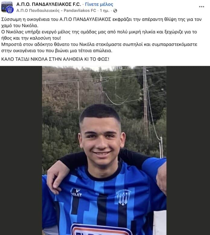 “Σύσσωμη η οικογένεια του Α.Π.Ο ΠΑΝΔΑΥΛΕΙΑΚΟΣ εκφράζει την απέραντη θλίψη της για τον χαμό του Νικόλα. Ο Νικόλας υπήρξε ενεργό μέλος της ομάδας μας από πολύ μικρή ηλικία και ξεχώριζε για το ήθος και την καλοσύνη του!